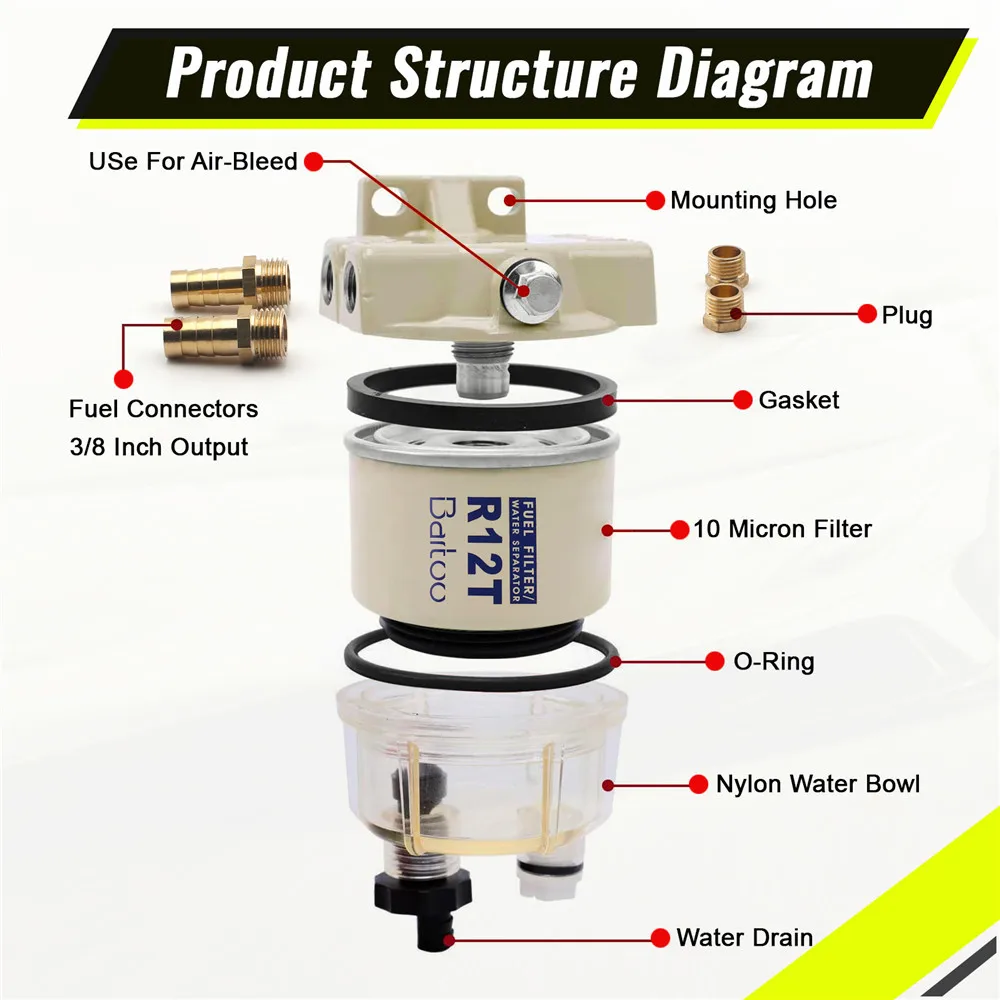 1. The filter is designed for high-performance applications. With a for flow rate of 30 gph on the R12T, your engine will perform better than ever on clean, waterless fuel.