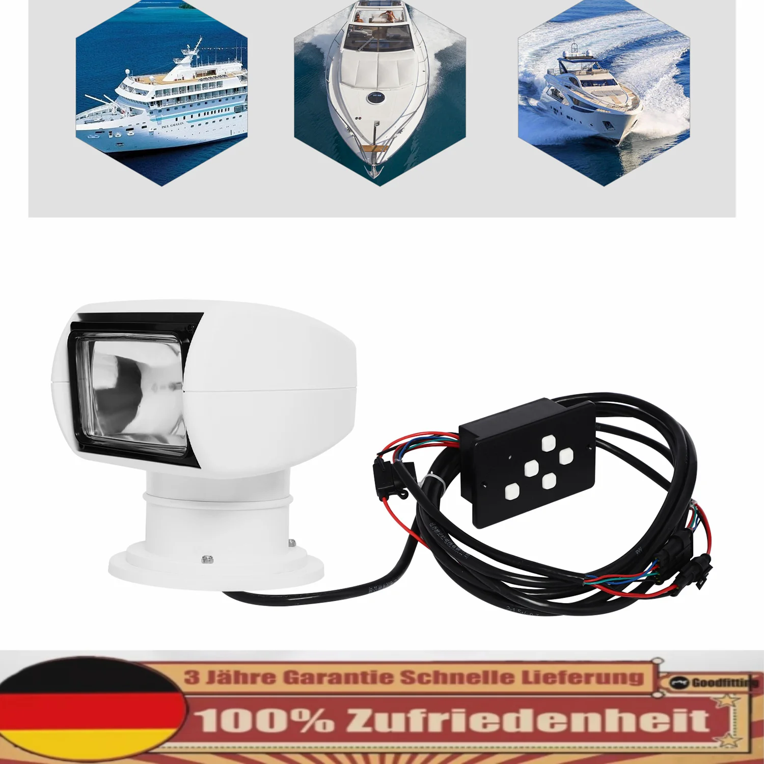 This remote control searchlight is made of high-quality materials with a high protection level, even in harsh marine environments, it can operate as usual, is stable, and long-lasting. The high-quality halogen bulb has good performance and long service life, the lightweight design makes it easy to carry, and the remote control design allows you to adjust the direction of light according to your needs, which makes the operation easy. It is not only a searchlight but also a tangible embodiment of the endless desire to explore the ocean. Let this searchlight accompany you to travel the world, explore the unknown, and write your own light and shadow legend.