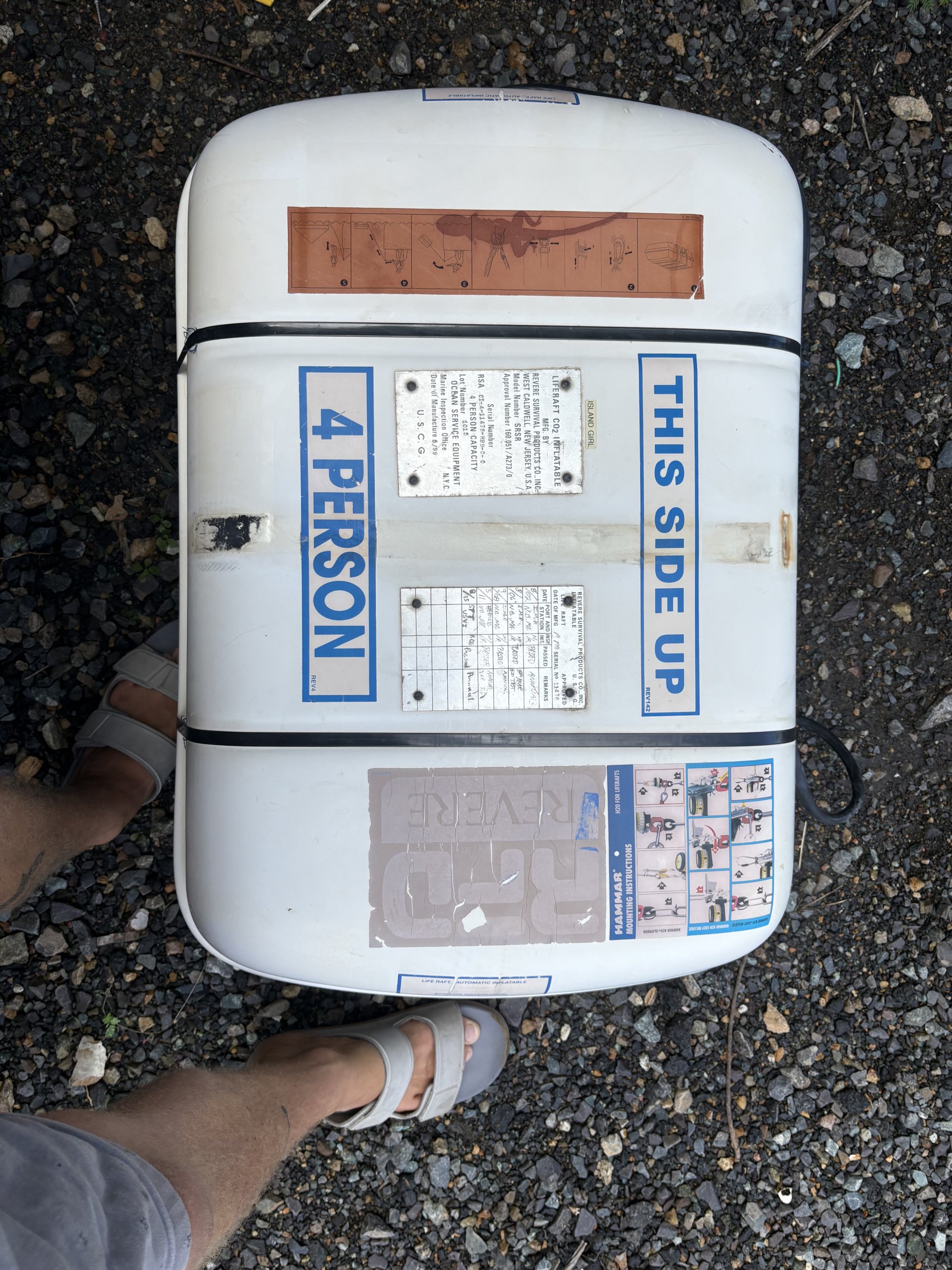 Used 4-person life raft with hydrostatic release, needs inspection. Needs inspection.