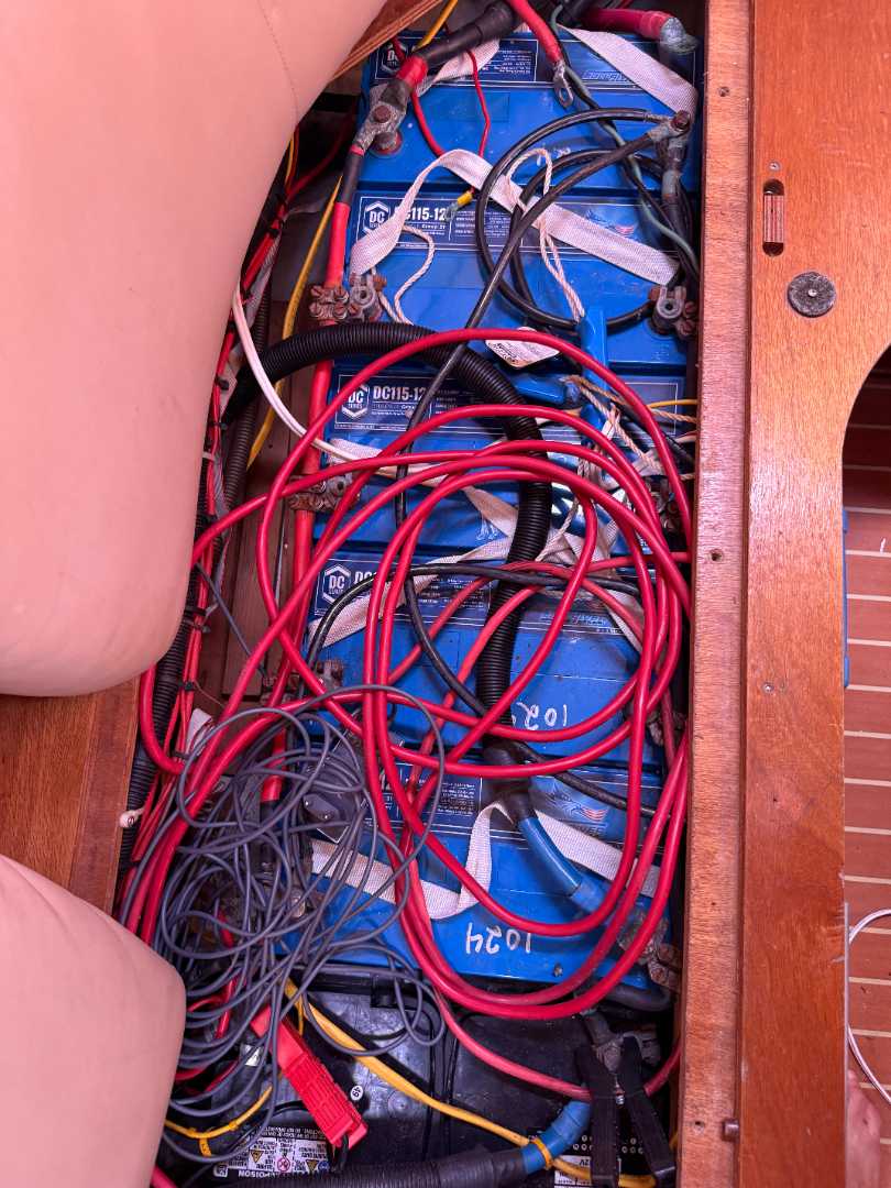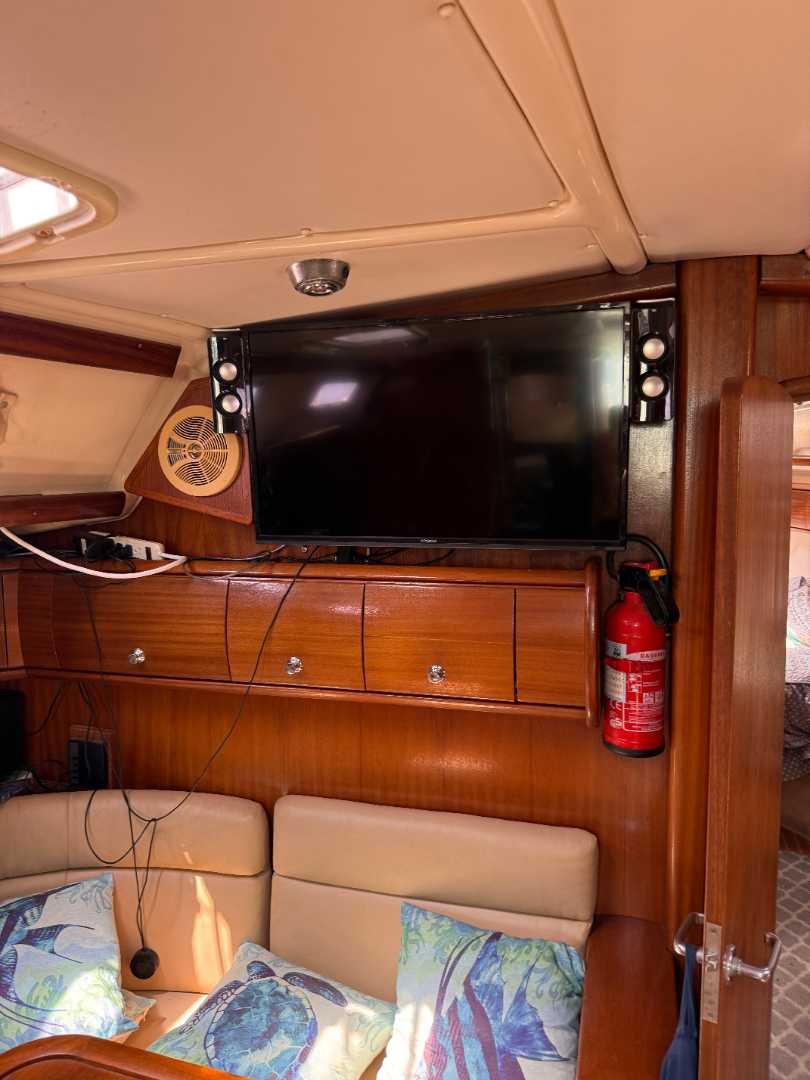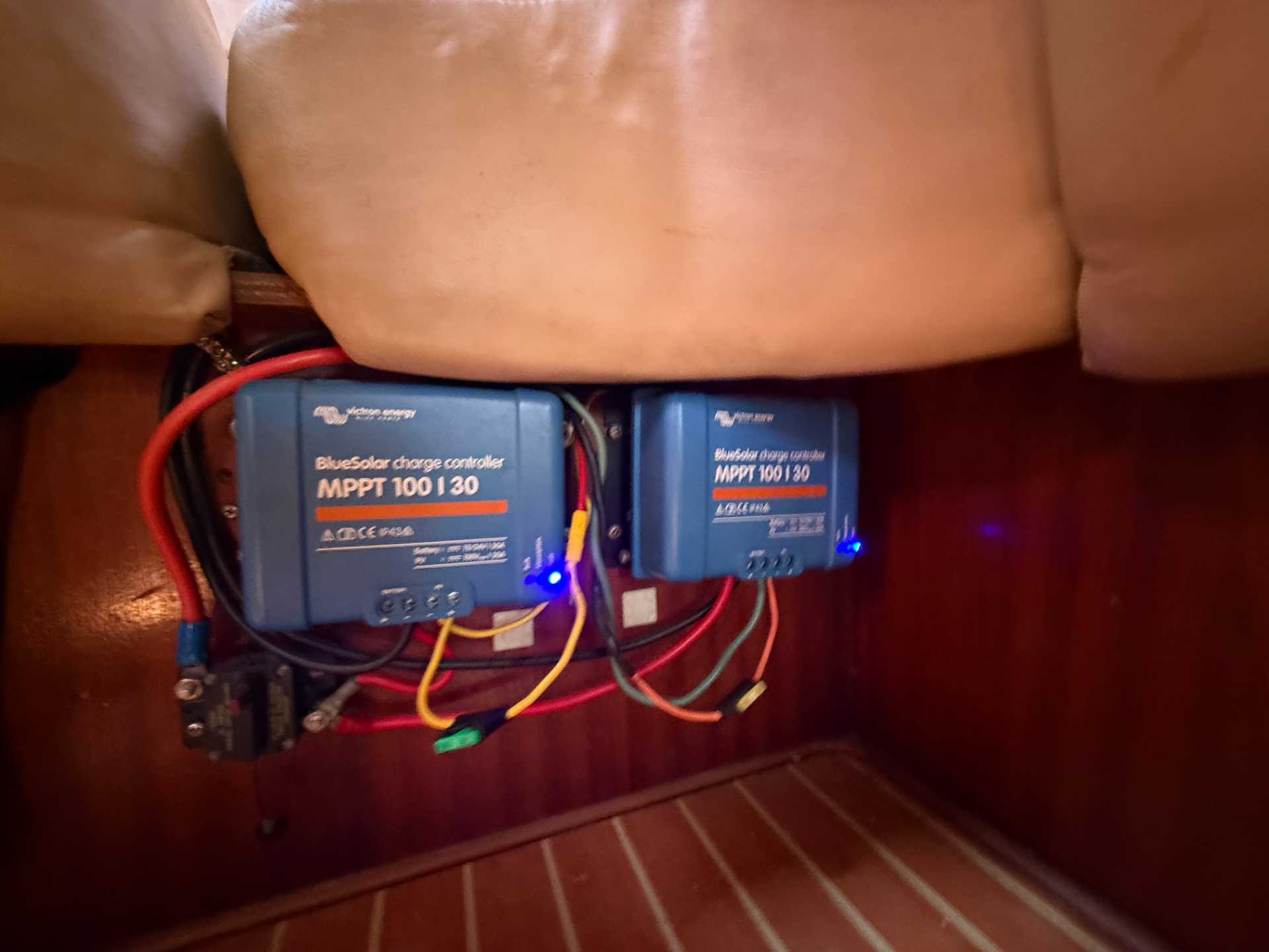 Inside, the layout offers three private cabins (two aft and one forward) plus three heads with showers. The galley is fully equipped with a propane oven, a Frigoboat refrigerator and a Coolmatic fridge/freezer. A large chart table houses navigation equipment, and the saloon includes a 32‑inch Samsung TV and a Sony Blu‑ray player. The electrical system features three house batteries, an engine‑start battery, a 125‑amp Outback charger/inverter, and an 80‑amp alternator. Renewable power is provided by a 315‑W LG solar panel plus two 130‑W Kyocera panels feeding Victron MPPT charge controllers. Comfort systems include a 16 000 BTU Cruisair air‑conditioning unit in the saloon.