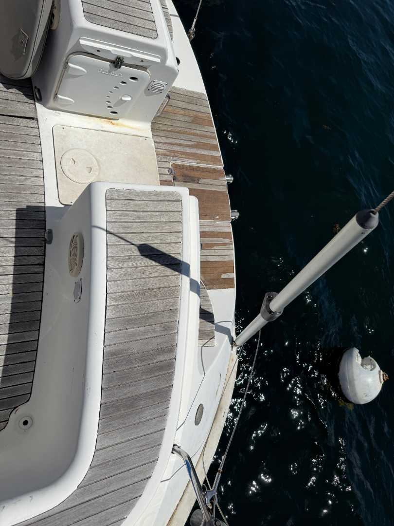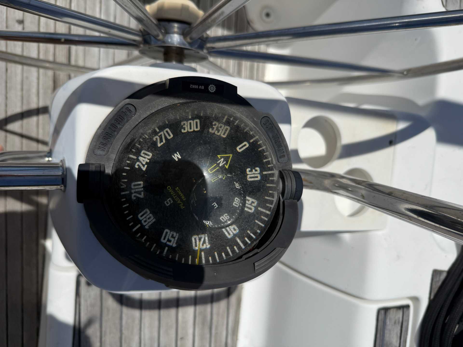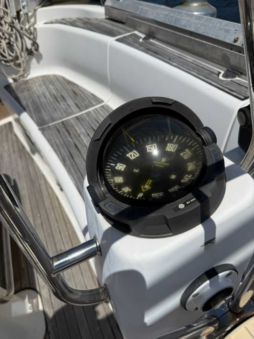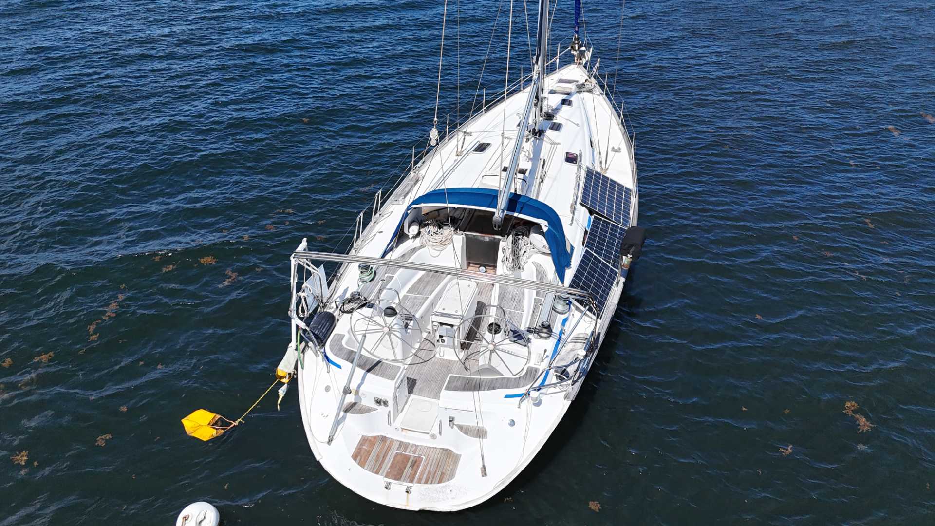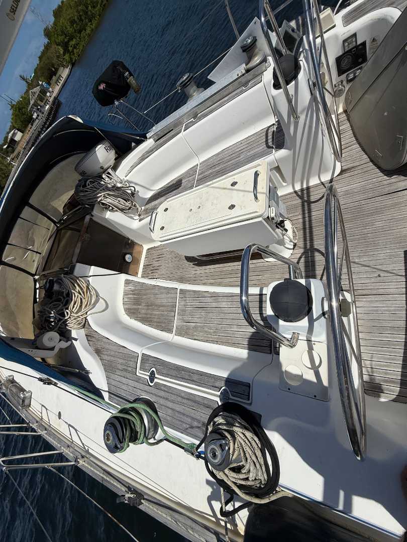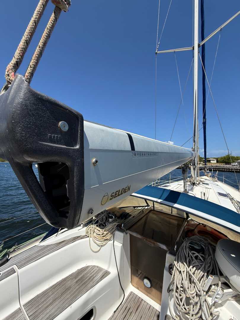 The yacht is a fractional‑rig sloop with a Selden anodized‑aluminum mast and Furlex headsail furler. She has a furling mainsail and furling genoa; both sails were replaced recently, and the boat is reported to have a new tender. Deck hardware includes Harken self‑tailing winches, a Lofrans Tigress windlass and ground tackle comprising Delta, Barnacle and Danforth anchors. Twin helm stations and a teak‑soled cockpit are protected by a bimini and spray‑dodger; a walk‑through transom with swim ladder makes boarding easy.