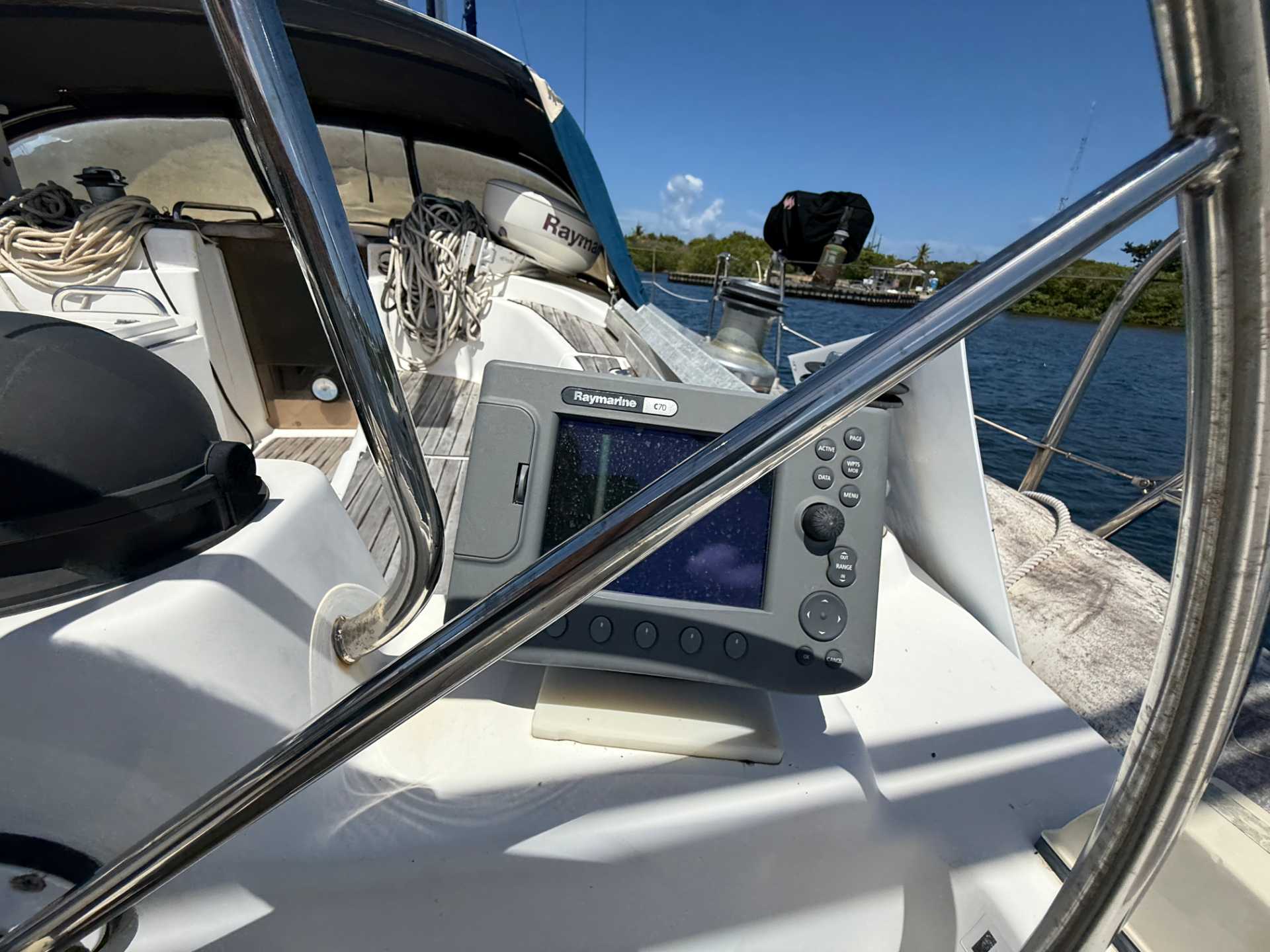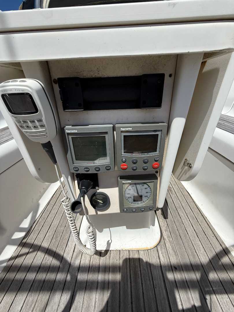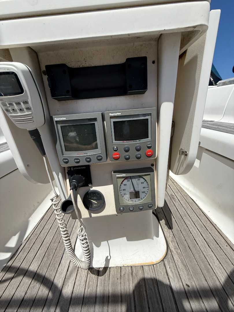 Navigation electronics consist of a Raymarine C‑70 color chart‑plotter at the helm, a Raymarine ST‑6001 autopilot, Raymarine ST‑60 wind and tri‑data instruments, and a Horizon VHF. Safety gear includes multiple lifejackets, a Viking eight‑person life raft (needs servicing), EPIRB and fire‑extinguishing systems. The vessel also has a bow thruster for easy docking and a three‑bladed folding propeller.