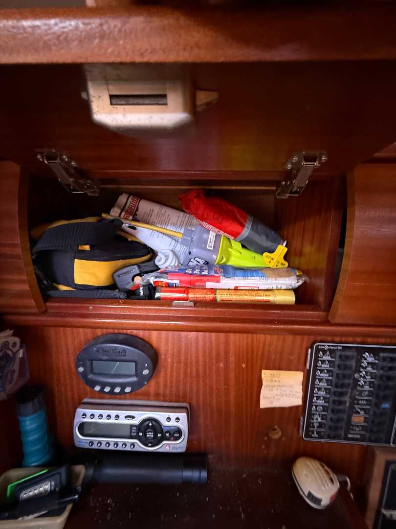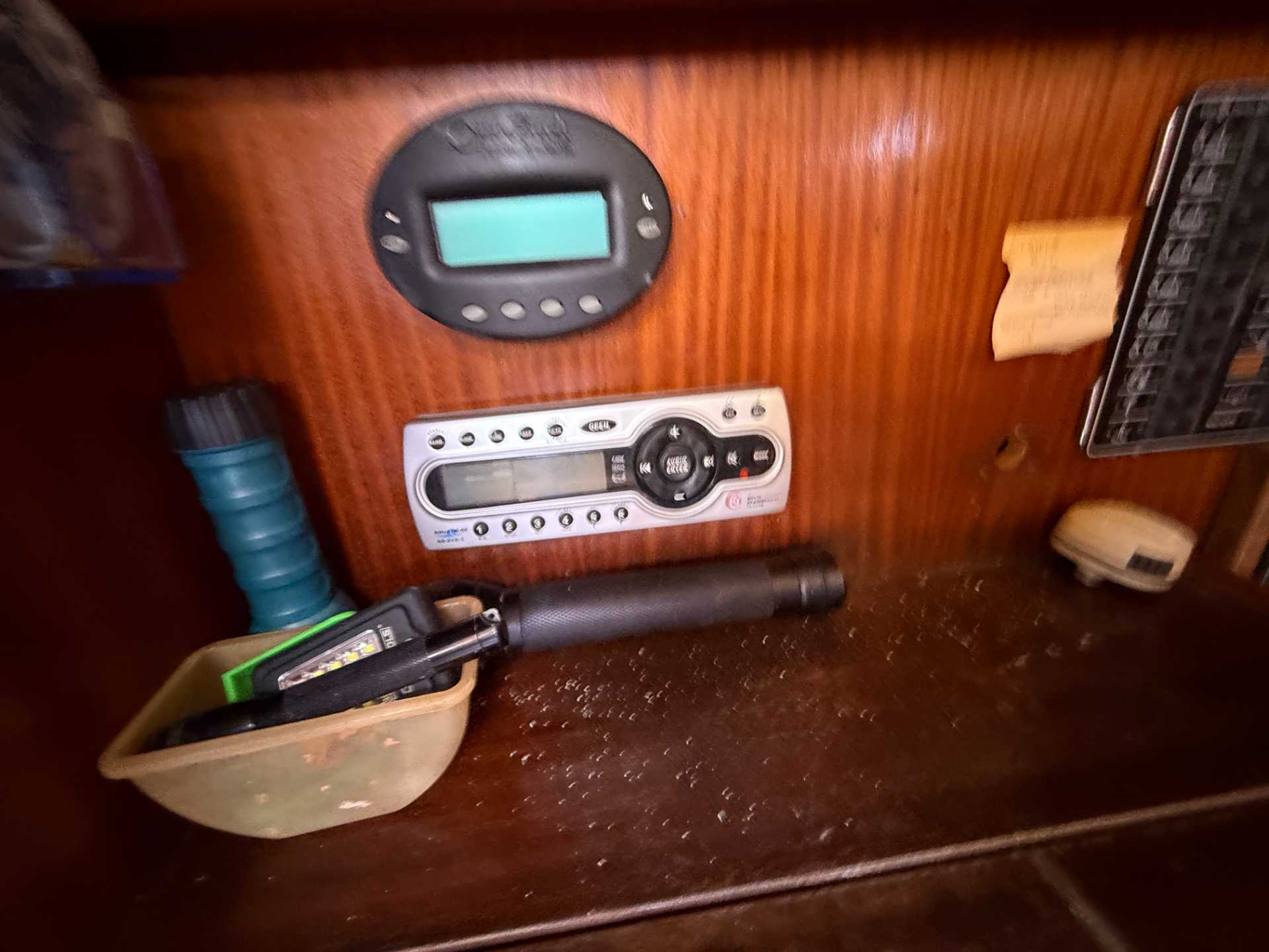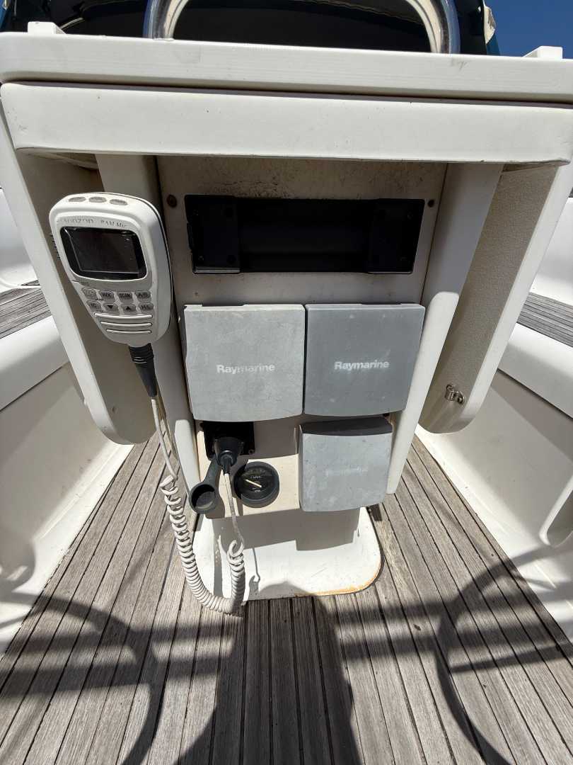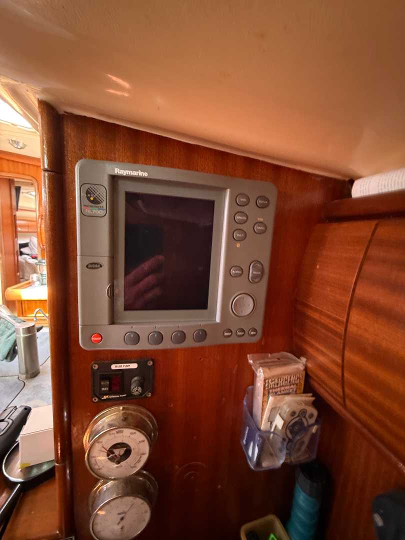 Navigation electronics consist of a Raymarine C‑70 color chart‑plotter at the helm, a Raymarine ST‑6001 autopilot, Raymarine ST‑60 wind and tri‑data instruments, and a Horizon VHF. Safety gear includes multiple lifejackets, a Viking eight‑person life raft (needs servicing), EPIRB and fire‑extinguishing systems. The vessel also has a bow thruster for easy docking and a three‑bladed folding propeller.