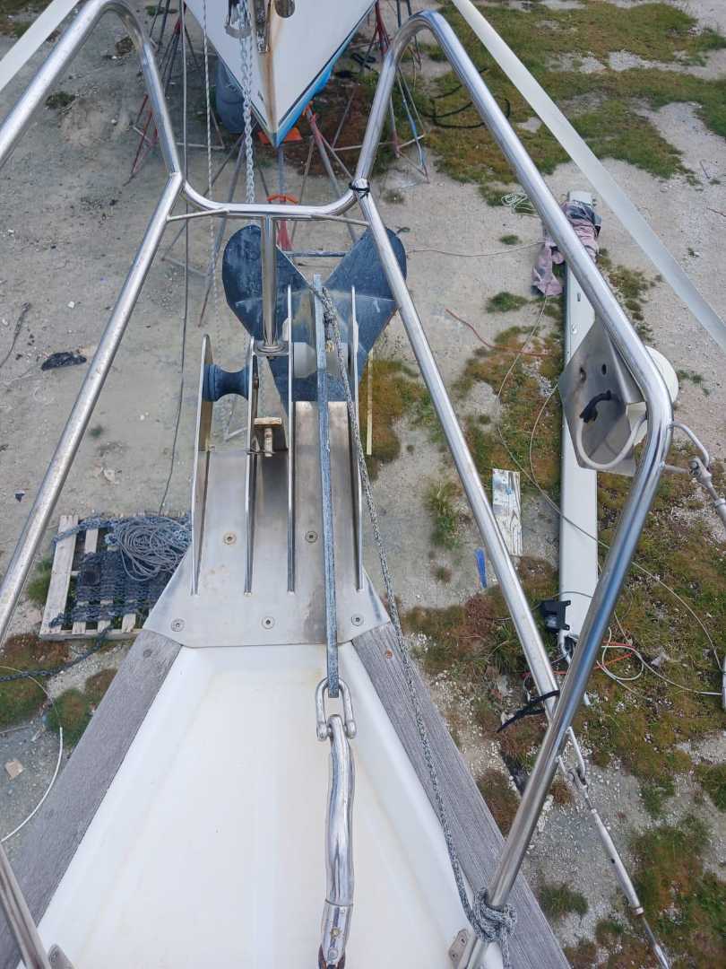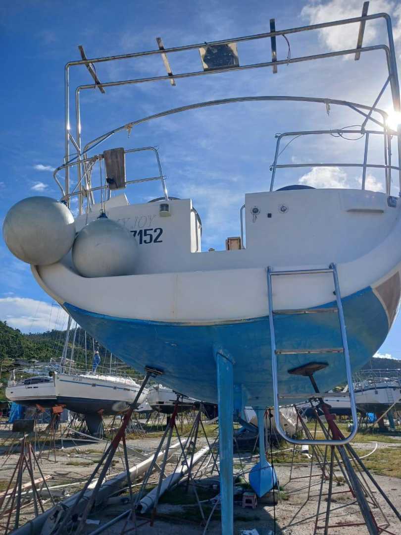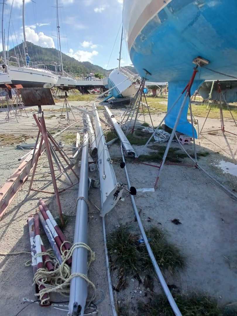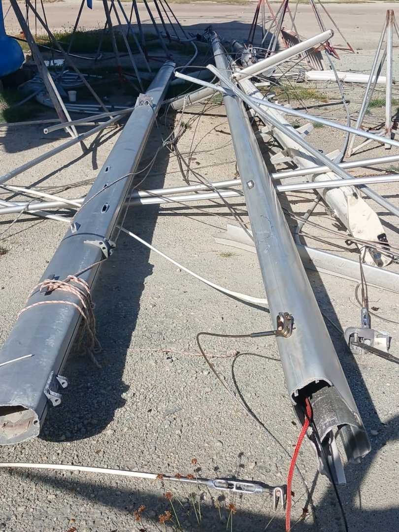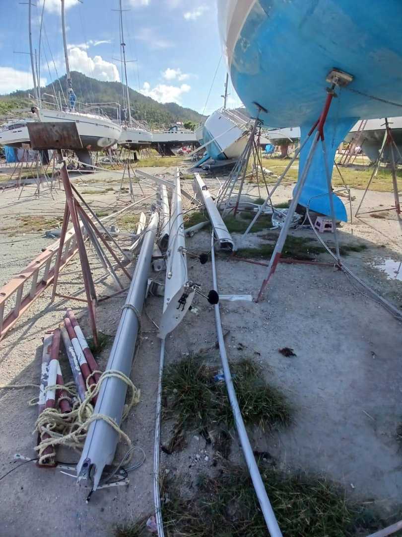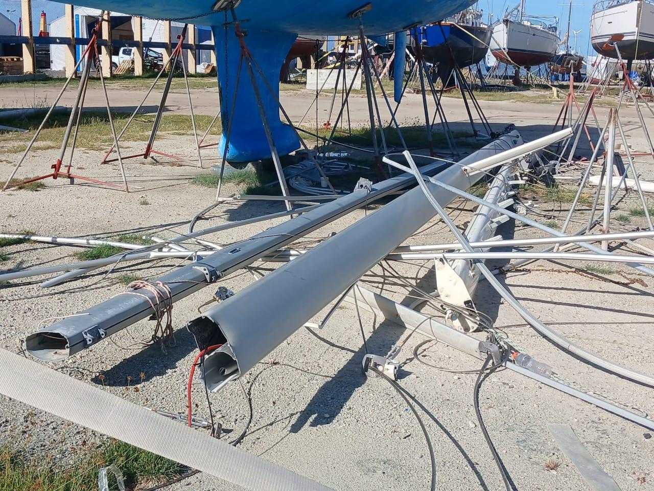 - Condition Note: The furler and mast are beside the boat; the vessel fell off its stands during a storm.