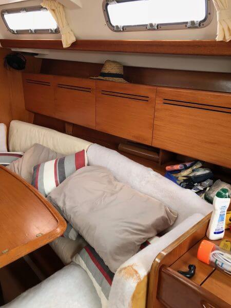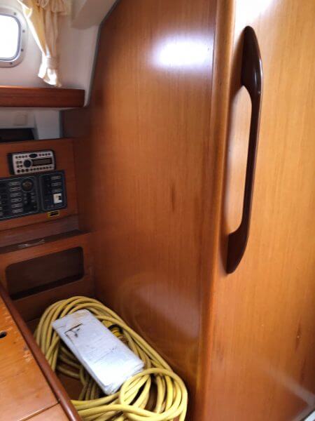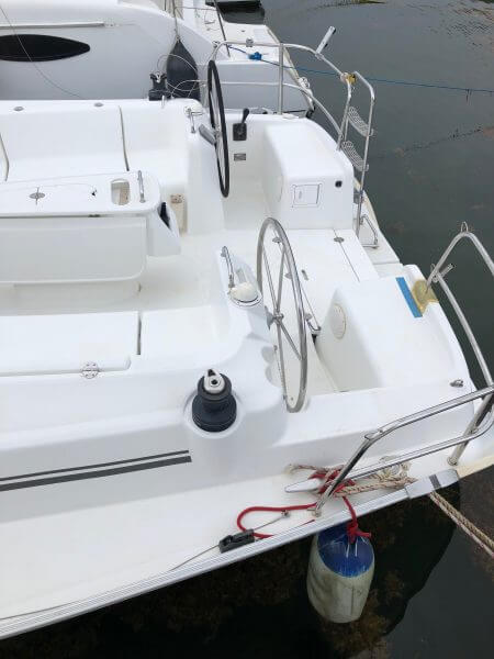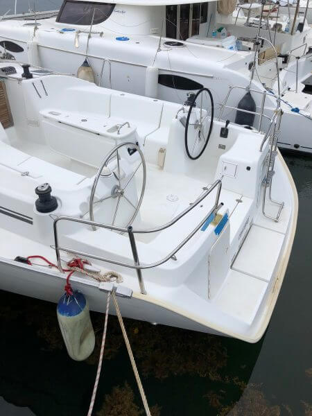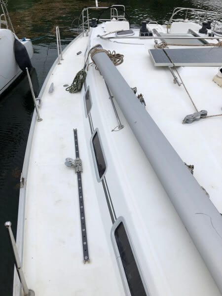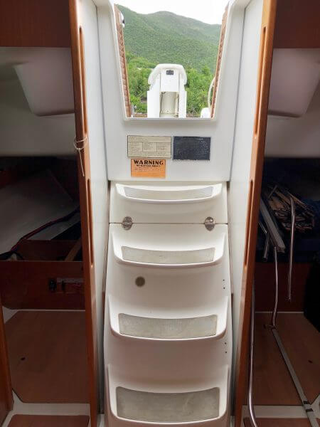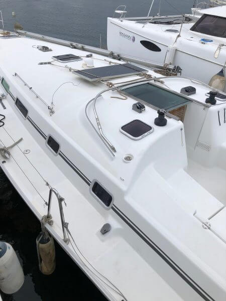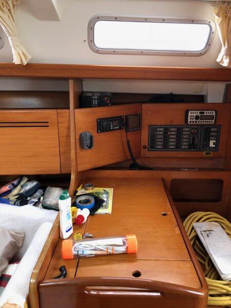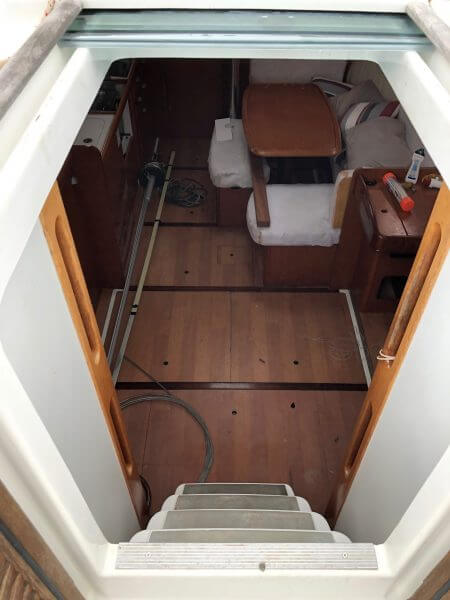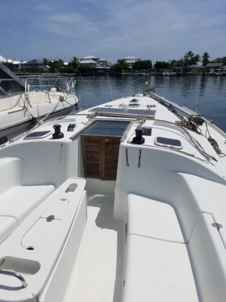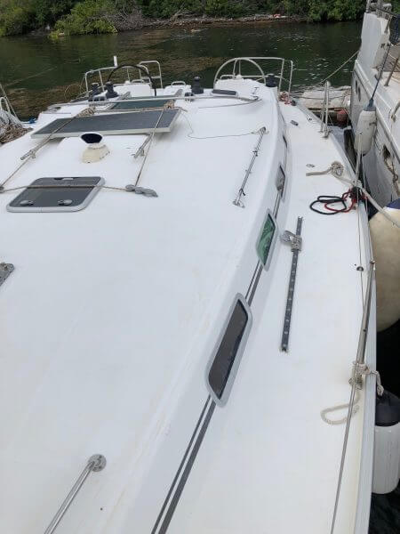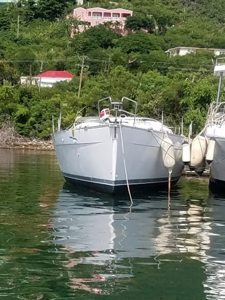 Beneteau Cyclades 43.3 for sale was a Charter vessel that was slightly damaged from the 2017 hurricanes. The mast is stored ashore an can be reattached. The vessel does need new rigging. Some stanchions and life lines need replacing. The main sail and head sail are stored safely below deck. Minus the damages top side, Crackers is driveable and her engine is in excellent condition with recent service to the steering. This vessel was NOT submerged and is dry inside with electrical systems in good condition along with new house batteries.