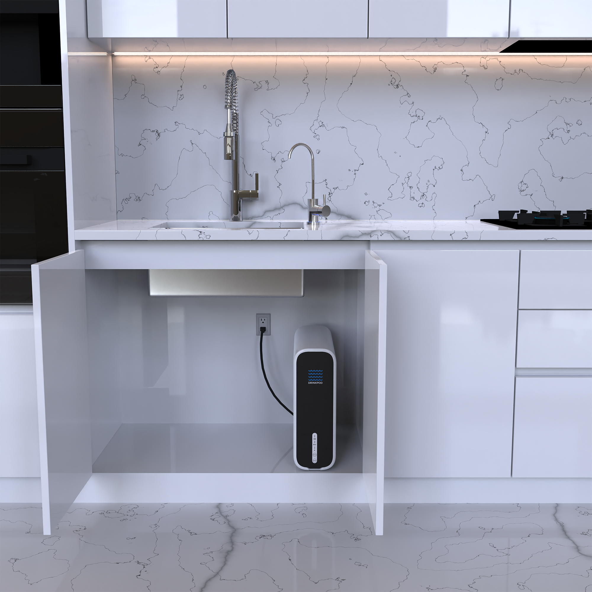BUILT-IN FILTER LIFE INDICATORS AND EASY MAINTENANCE: The Drinkpod Tankless Reverse Osmosis System is designed to make filter replacement easy and hassle-free. The built-in filter life indicator lights up in white when the corresponding filter has less than 10% life remaining and turns red when the filter needs to be replaced. With its integrated-water-route technology, this system is easy to install and maintain, and its twist-and-lock design makes filter replacement a breeze.