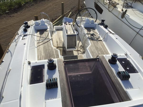 – A 6”x6” area of teak over the port cockpit seat has been gouged.