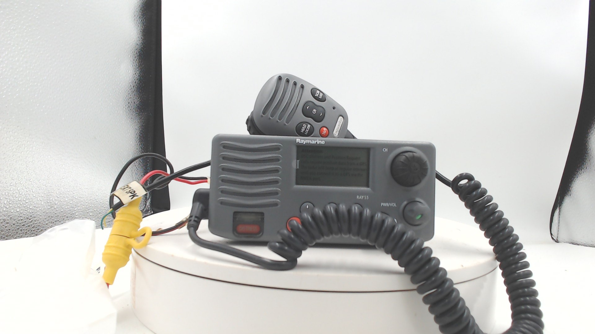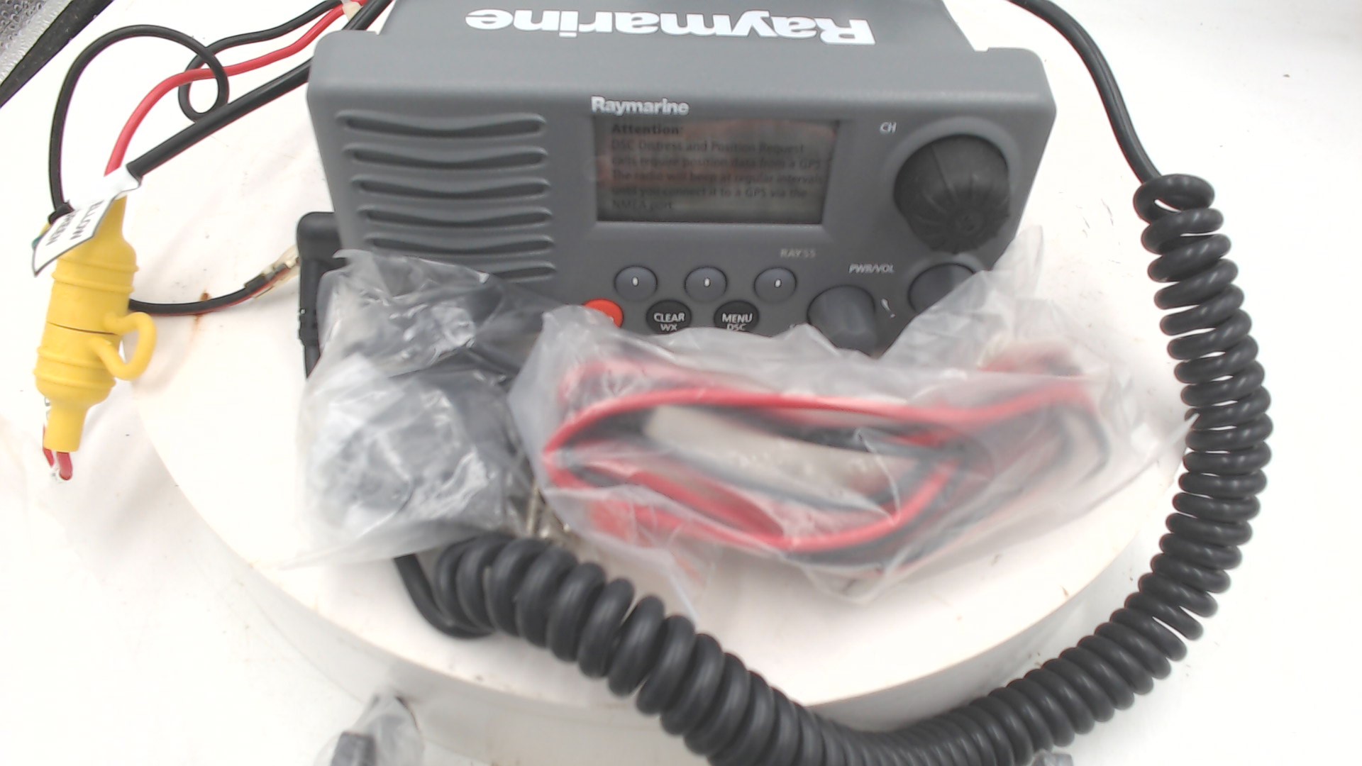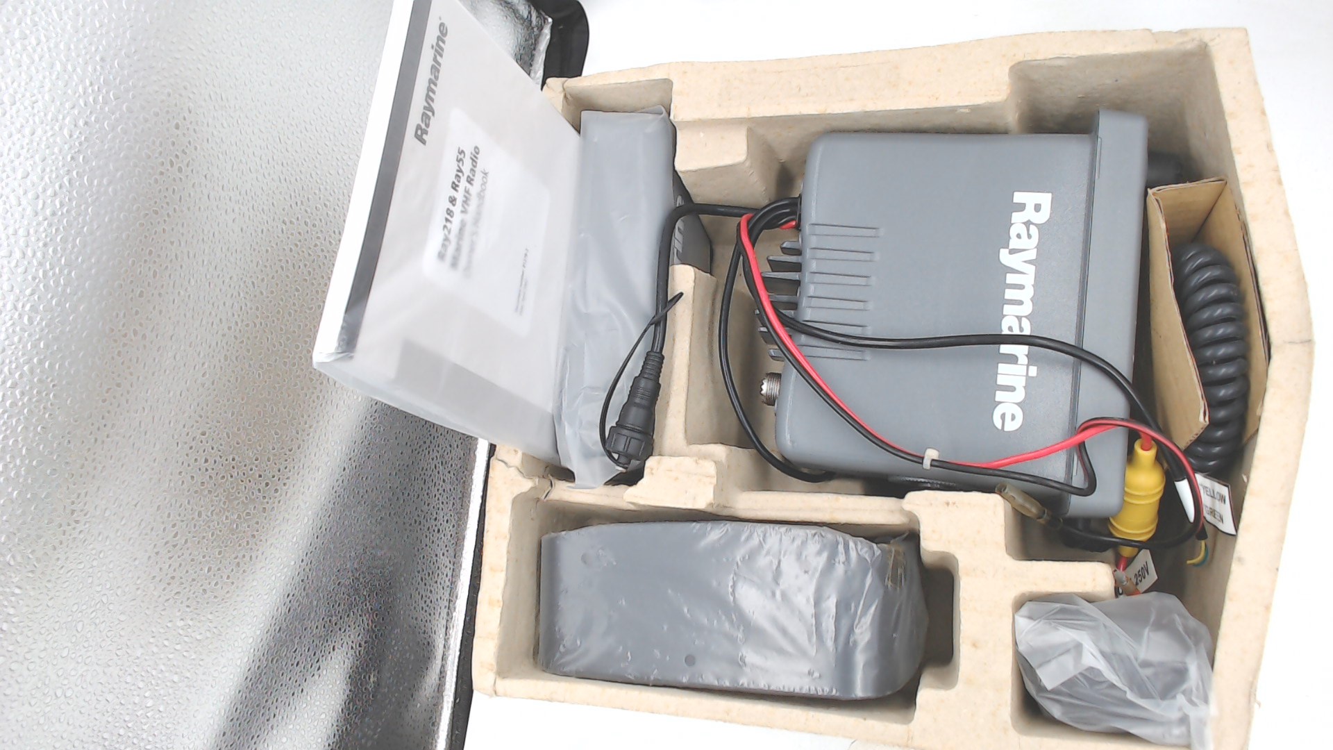 Package Contents:Ray55 VHF w/Microphone Mounting Bracket Mounting Hardware Microphone Hanger Power Cord Sun Cover
