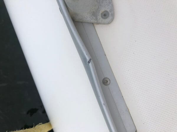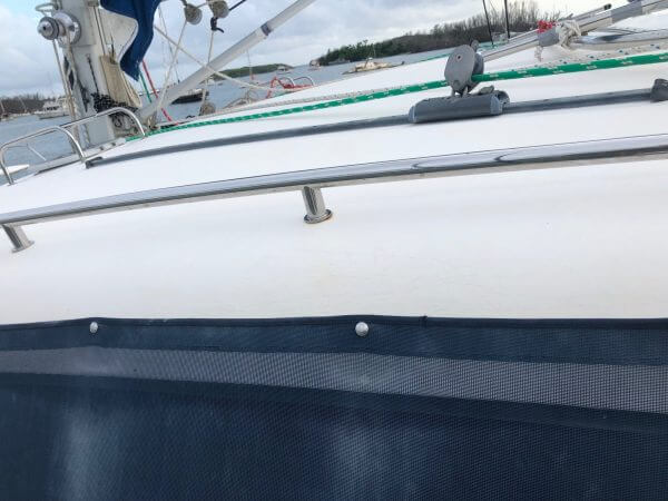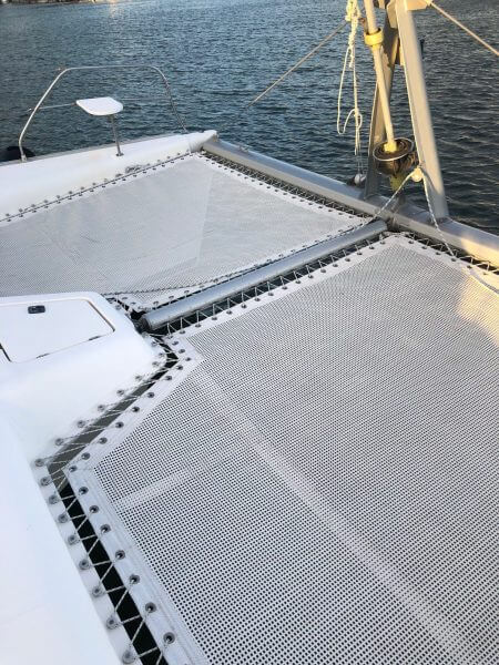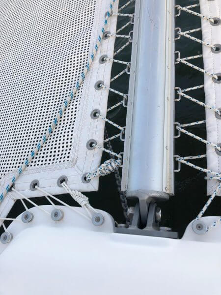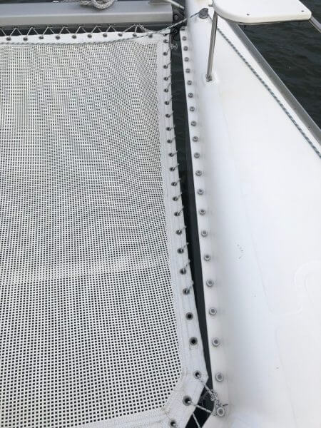The Starboard Trampoline eyelets and line are stretched and detached from the hull.