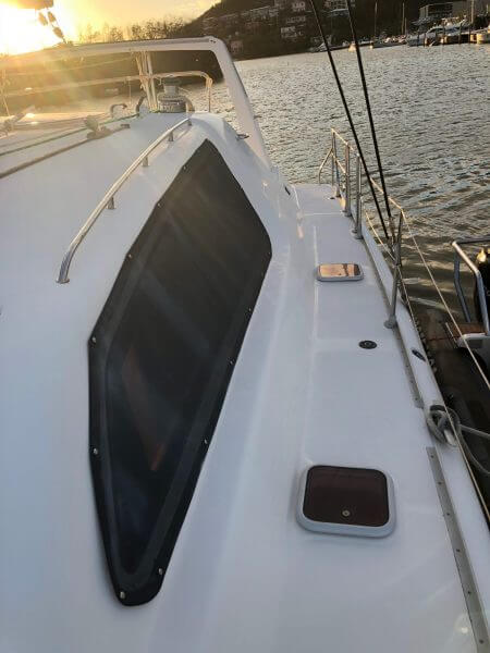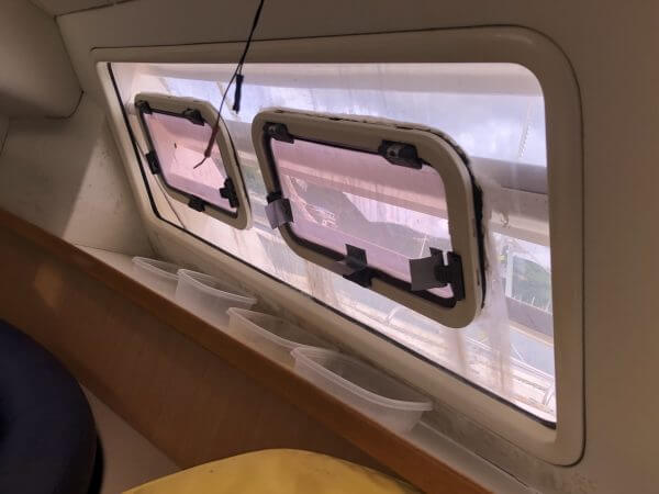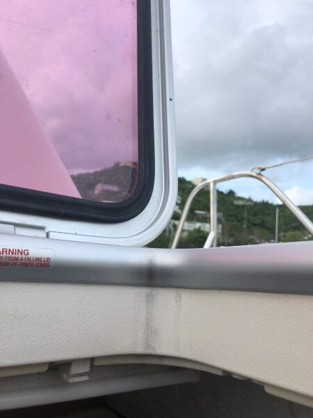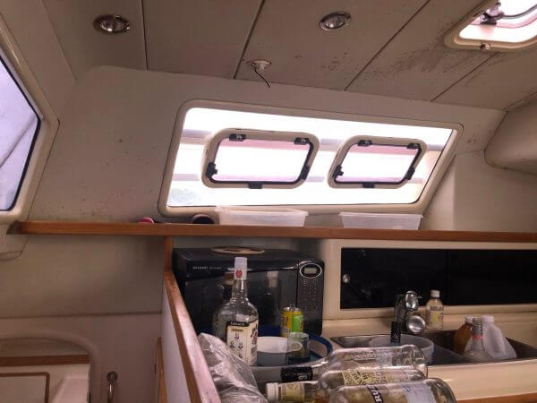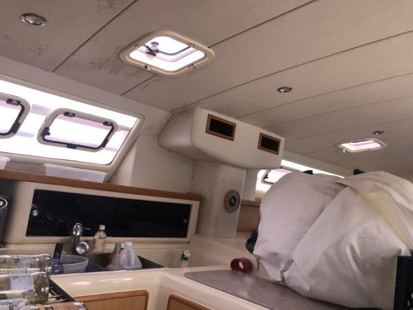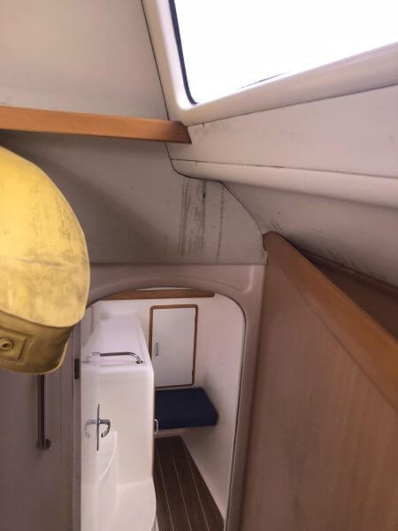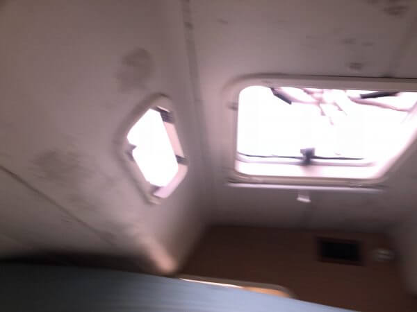 Port and skylights show signs of leaking and water damage.
