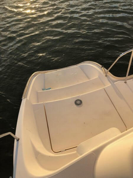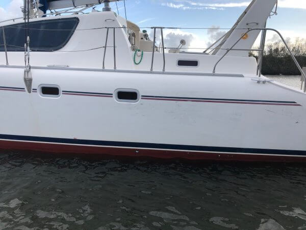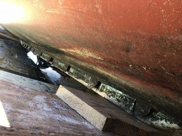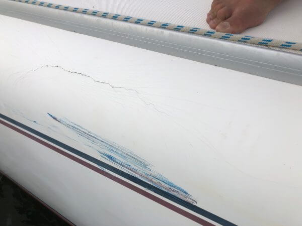 The exterior of the hull around the vessel has scratches and scuffs throughout most areas.