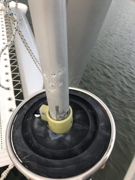 The forward jib topping lift shows signs of corrosion.
