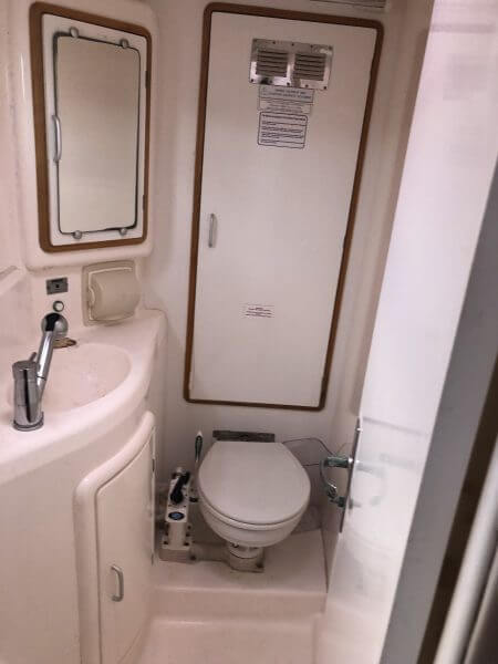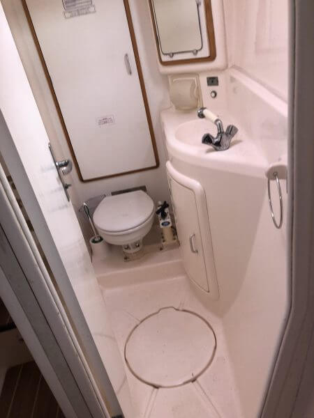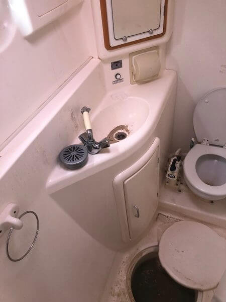 Interior Aft Port head seawater came in through the sink thru hole and flooded the bathroom with sand and
