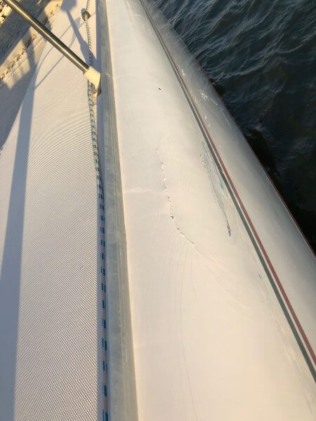 Exterior of the hull on the starboard side forward near the gunnel has a compression impact from hitting another