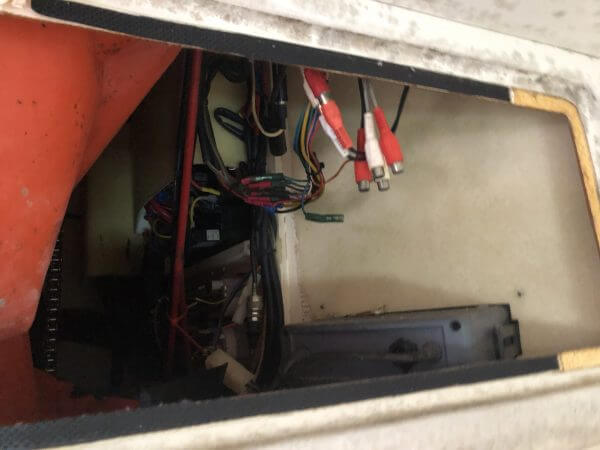 JL stereo speakers are missing over plates and show signs of weather wind damage.