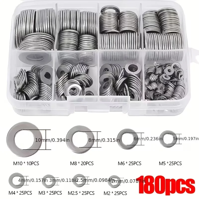 Stainless Steel Flat Washer Assortment Kit (M2, M2.5, M3, M4, M5, M6, M8, M10) - Suitable for Home Decorations& Factory Repairs