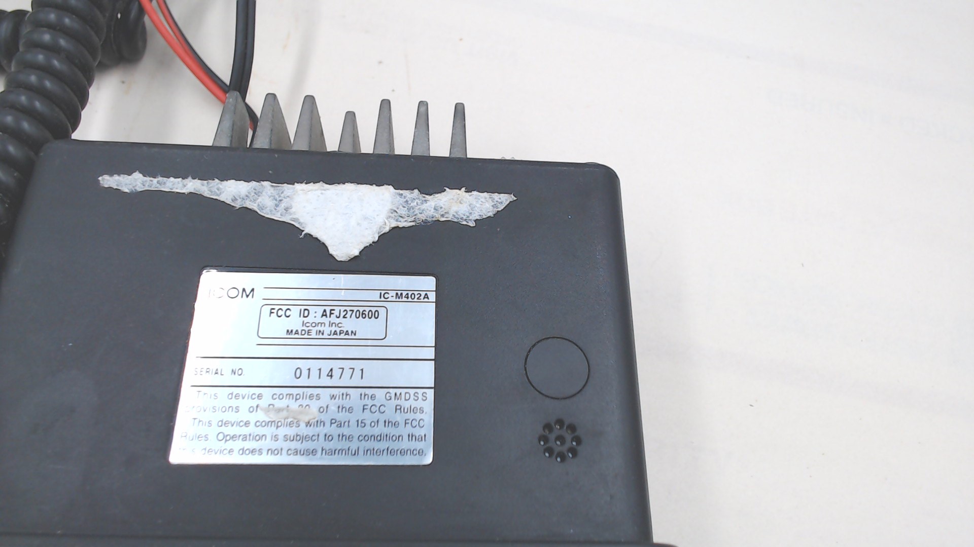 ICOM VHF Radio Used. IC-M402A. FCC ID: AFJ270600. Serial No 0114771. HM-141B- Microphone. ICOM