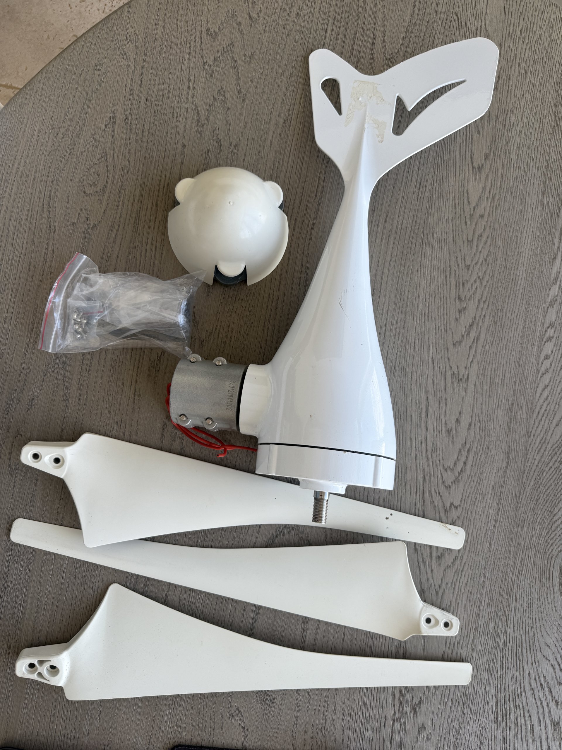 For sale is a Marine Wind Generator that has never been used. It comes with minor scratches due to handling but is in good condition, out of the package. The wind generator features three red wires, and the housing is marked with the number 020121041902. This is an excellent addition for anyone looking to harness wind energy on their boat or marine setup.